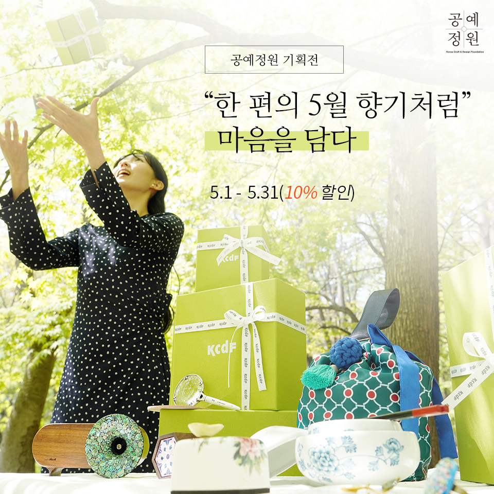 KCDF갤러리숍 `공예정원`에서는 5월 기획전“한 편의 5월 향기처럼 마음을 담다”주제로 다양한 공예 상품들을 추천한다. 5월의 봄을 가득 담아 드리는‘봄 선물’에는 모란 오르골(에이치케이스튜디오), 시작하려 함 / 반지함(김지우 작가), 자청비 반지(공진원), 오하 브로치(임상아 작가), 도자의 정원 조리개 가방(공진원) 등으로 구성된다.