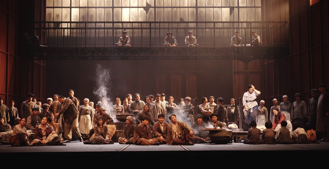 지난 27일 국립오페라단의 <1945> 초연을 보면서는, 13일 기자간담회 때 제작진 설명 그대로 충실히 잘 조직되었음을 느꼈다. 특히 작곡가 최우정의 음악을 중심으로 배삼식의 대본이 살아나고, 정치용 지휘의 코리안심포니까지 극저음으로 시작해 의도적으로 중음역대를 공허하게 비우고, 소프라노의 최고음까지로 인생의 깊은 절망과 끝없음을 표현하고 있었다. 낭만이후 현대오페라를 겨냥한 것은 분명했지만, 동요 '엄마야 누나야'부터 1930-40년대 창가와 트로트, 군가 등을 짧은 순간씩 녹여내며 익숙함을 주었다.