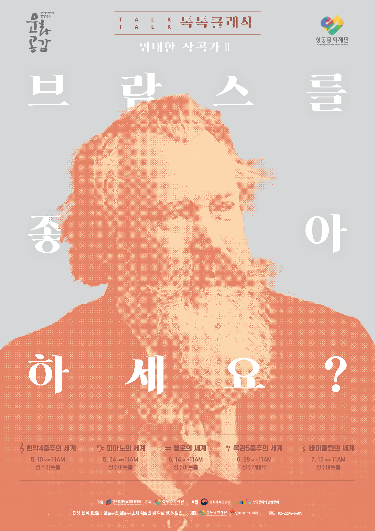 5월부터 7월까지 성수아트홀과 성수책마루에서 진행되는 톡톡(TALK TALK) 클래식 위대한 작곡가 Ⅱ - '브람스를 좋아하세요?'는 브람스의 작품을 피아노, 바이올린, 첼로 독주곡 외에도 현악4중주, 목관5중주 등 5회차로 프로그램을 구성하여 관객들에게 선사한다.