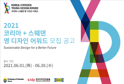 ‘코리아+스웨덴 영 디자인 어워드’는 디자인을 통해 한국과 스웨덴의 교류를 더욱 활성화하고, 나아가 디자인 분야에 대한 관심을 높이기 위해 마련된 공모전으로, ‘혁신’, ‘지속가능성’, ‘더 나은 미래’라는 3대 핵심 가치의 디자인을 추구하며 운영된다. 2021년 주제는 ‘더 나은 미래를 위한 지속가능한 디자인(Sustainable Design for a Better Future)’으로, 포스트 코로나19 시대와 기후변화의 위기를 극복하고 더 나은 미래를 여는 원동력으로써 디자인이 지닌 힘을 조명할 것으로 기대된다.