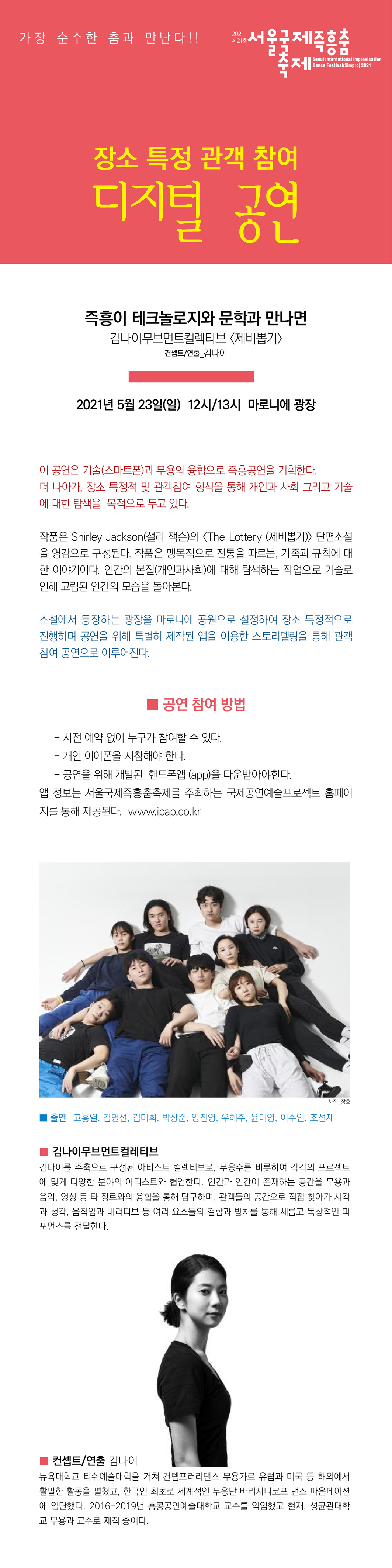 [플레이뉴스 문성식기자] 2021년 제21회 서울즉흥춤축제는 5월 23일 정오 12시에 마로니에 공원에서 김나이무브먼트컬렉티브 주최로 '제비뽑기'라는 장소특정형 즉흥 퍼포먼스를 실시한다. 별도의 예약은 필요없으며 개인이어폰을 반드시 지참해야 한다. 자세한 내용은 아래 이미지를 참조하면 된다.