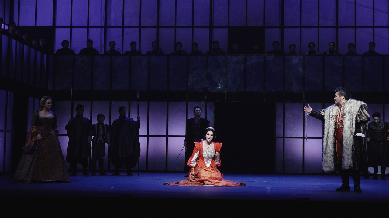 긴 서곡이 연주되고 그 사이 붉은 장막에 자막으로 메리 스튜어트, 앤 불린 등 헨리8세의 여섯 아내의 이름과 설명이 보이니 영국 16세기 왕위계승의 치열한 아들 낳기 전쟁이 잘 와 닿았다. 1막 1장 엔리코(헨리8세)와 조반나가 몰래 만나고, 미니멀한 ‘ㄷ’자 형태 무대 2층에서 추밀원단이 그 모습을 내려다보면서 안나 왕비에 대해 걱정하는 합창을 한다.