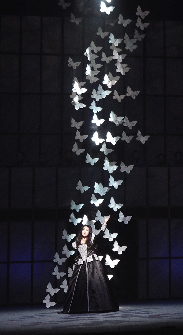 광란의 안나가 결혼식이라며 흰 면사포를 쓰겠다고 한다. 하늘을 향해 소용돌이쳐 날아오르는 나비장식 무대가 눈길을 사로잡는다. 왕관 모양의 천장 샹들리에가 내려와 나비장식과 안나를 감싸고 감옥이 된다. 나비 감옥 속 안나의 아리아 '울고 있나요...내가 태어난 아름다운 성으로 데려다 주세요(Piangete voi?... Al dolce guidami castel natio)'가 아련하다.