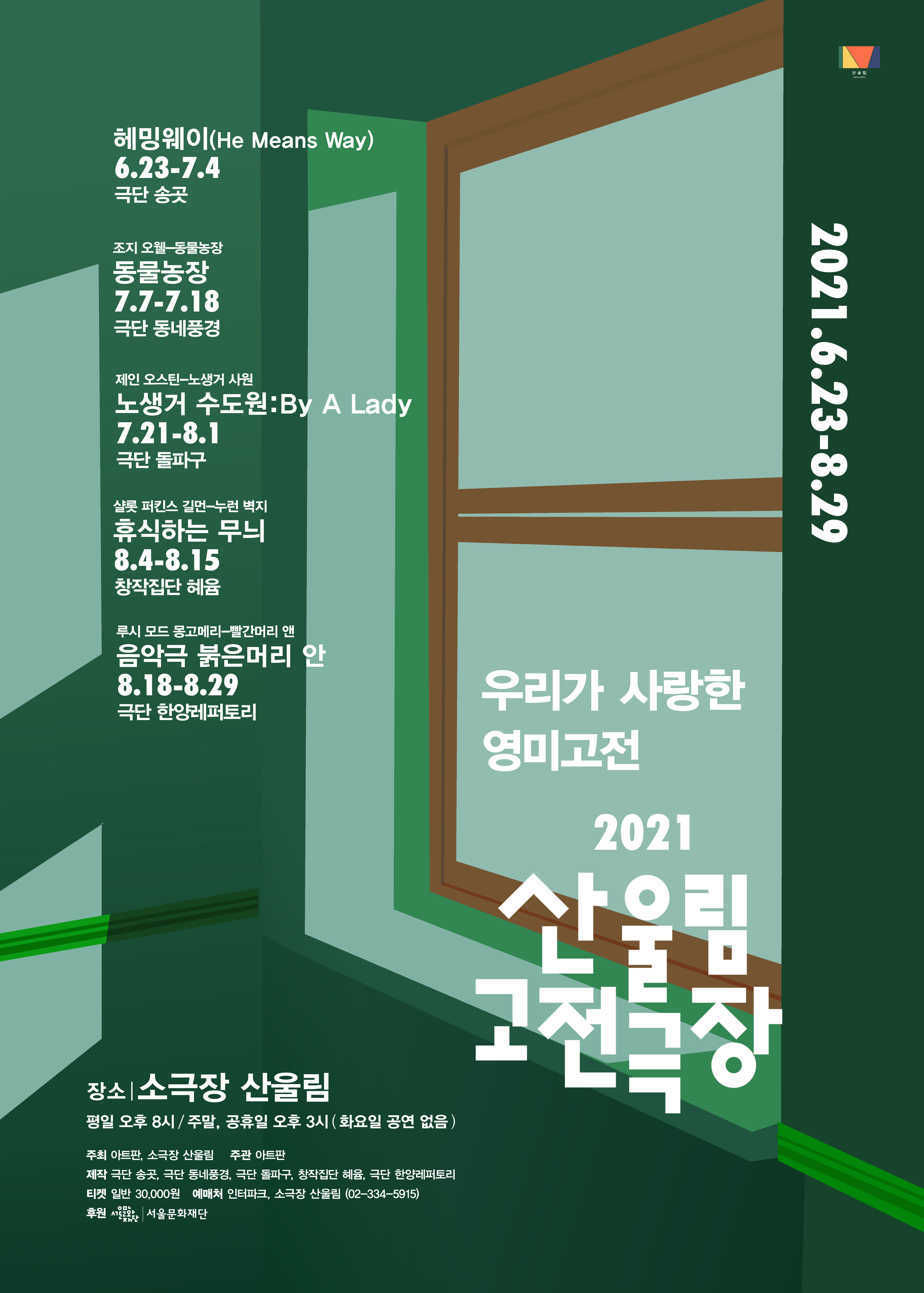 2021 산울림 고전극장은 6월 23일부터 8월 29일까지 영미 고전문학을 바탕으로 한 5작품을 통해 관객과 예술적 상상력을 키워나가는 자리를 마련하고자 한다.