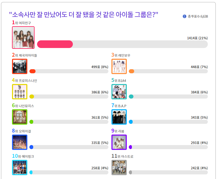 커뮤니티 포털사이트 디시인사이드(대표 김유식)와 취향 검색 기업 마이셀럽스가 운영 중인 `익사이팅디시`가 `소속사만 잘 만났어도 더 잘 됐을 것 같은 아이돌 그룹은?`으로 투표를 한 결과 여자친구가 1위에 올랐다. 이 투표는 지난 6월 6일부터 6월 12일까지 총 7일간 진행했다.