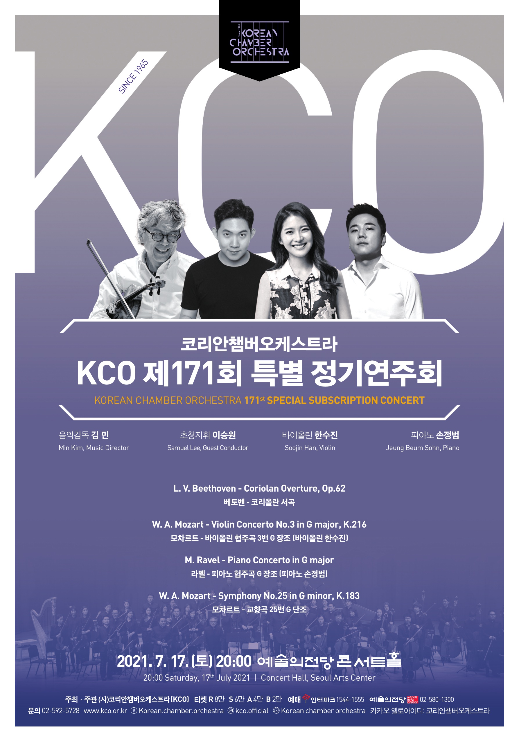 국내뿐만 아니라 유럽 무대에서도 음악성을 인정받아 큰 관심을 받고 있는 지휘자 이승원의 초청 지휘로 바이올리니스트 한수진과 피아니스트 손정범이 KCO와 함께 모차르트와 베토벤 그리고 라벨의 대표작들로 무대에 서서 기대를 모으고 있다.
