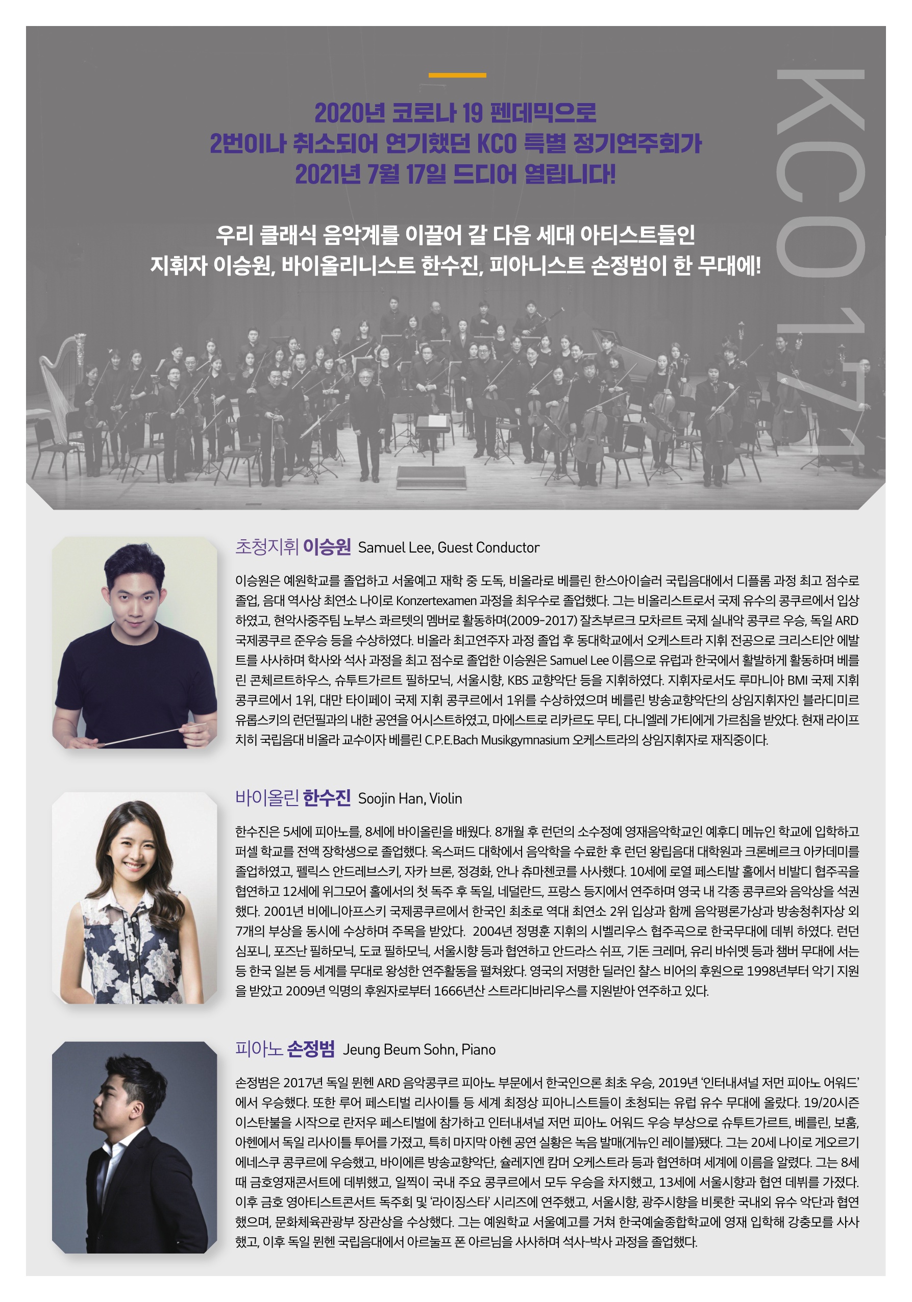 지난해 사회적 거리두기 조정 지침으로 인하여 반복적인 공연 취소에 대해 지난 2월부터 공연계의 정상화 요구가 높아지면서 사회적 거리두기 2.5단계에도 한자리 띄어앉기가 가능해지며 다시 무대를 준비하고 있는 KCO는 오랫동안 무대를 기다려주었을 관객들의 기다림에 보답할 수 있는 연주를 위하여 KCO 오케스트라 단원들뿐만 아니라 솔리스트로 나서는 연주자들도 연주 준비가 뜨겁다.