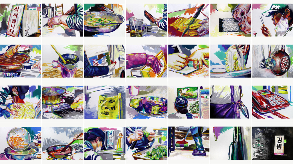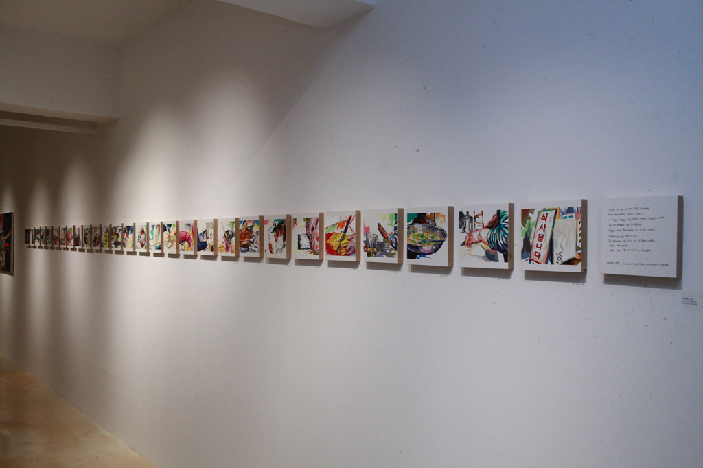 현재 전시 중인 작품명 "28개의 시간"은 분식집의 풍경과 한 사람의 하루를 시간대별로 하나의 파노라마처럼 드로잉 했다. 그림을 영상처럼 표현할 수 없을까? 이런 생각으로 출발해 이번 폴스타아트 갤러리라는 넓은 공간에 전시가 계획되면서 작업을 하게 되었다. 작품의 주인공은 작은 분식집을 운영하는 사장님의 이야기이다.