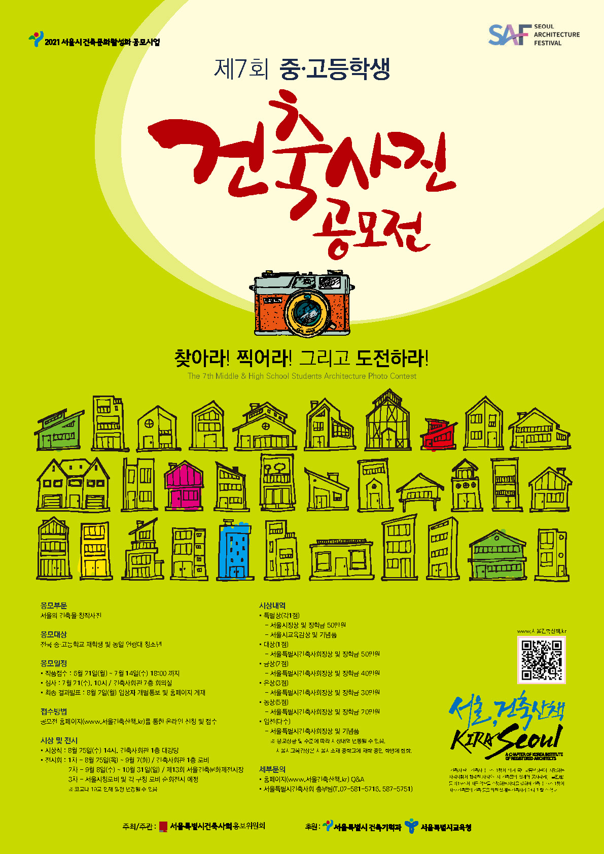 제7회 중·고등학생 건축사진 공모전은 ‘서울의 건축’을 주제로 서울 시내 건축물 사진을 접수한다. 작품은 700자 내외의 작품 설명을 더한 해상도 2200×1500 픽셀 이상, 파일 크기 10MB 이내 JPG 파일이어야 한다.