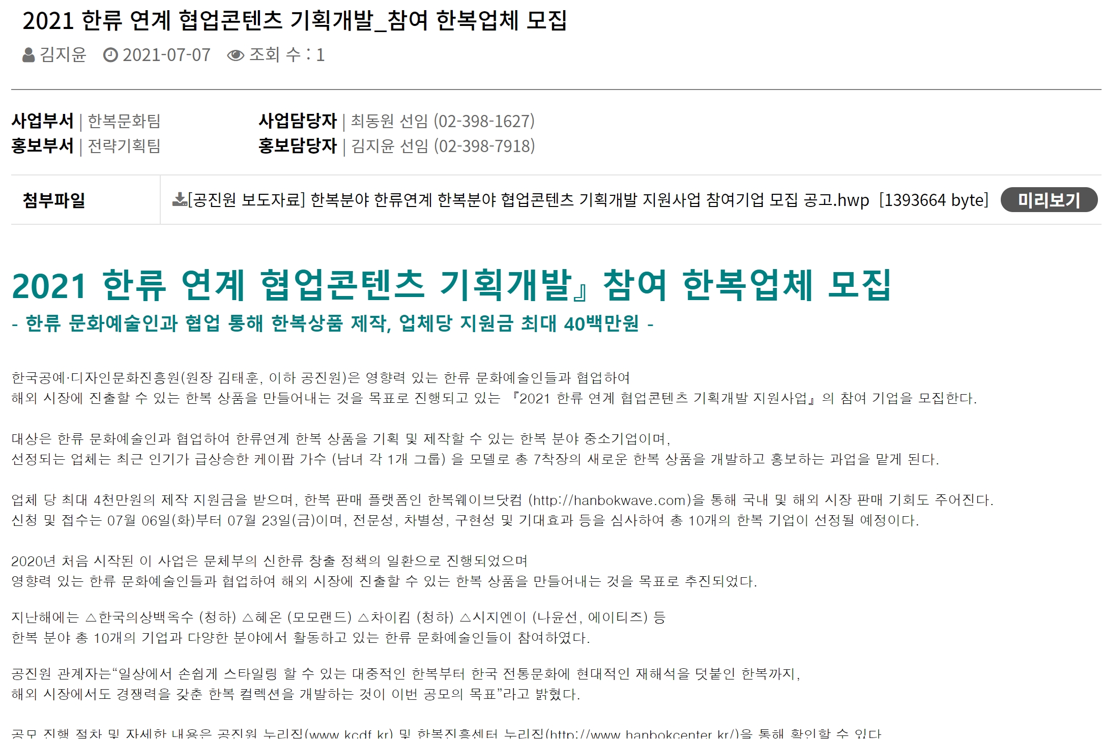 [플레이뉴스 문성식기자] 한국공예·디자인문화진흥원(원장 김태훈, 이하 공진원)은 영향력 있는 한류 문화예술인들과 협업하여 해외 시장에 진출할 수 있는 한복 상품을 만들어내는 것을 목표로 진행되고 있는 『2021 한류 연계 협업콘텐츠 기획개발 지원사업』의 참여 기업을 모집한다.