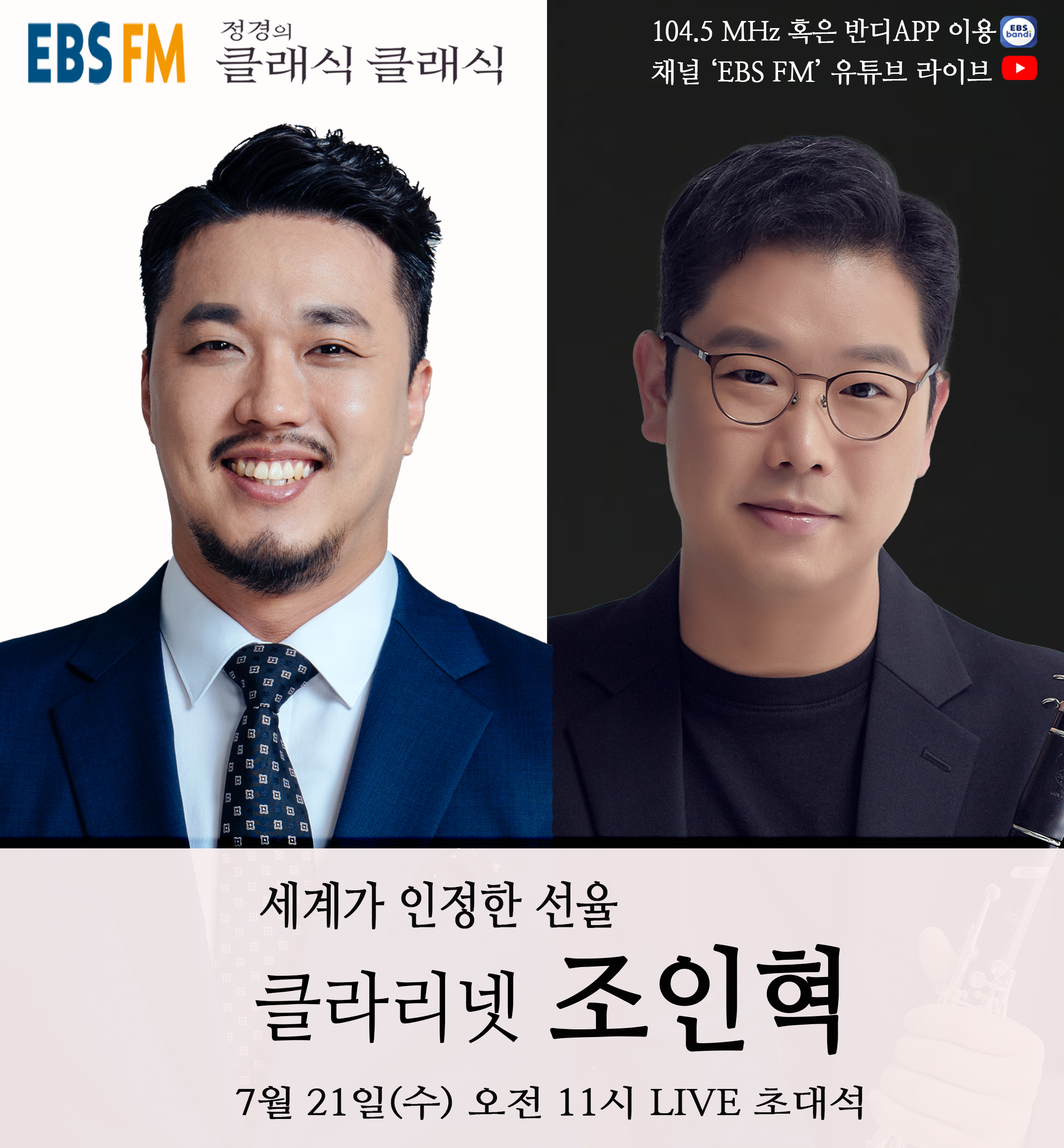 7월 21일 수요일 오전 11시에는 극도로 섬세한연주로 세계를 사로잡은 클라리네스트 조인혁교수가 출연 한다.