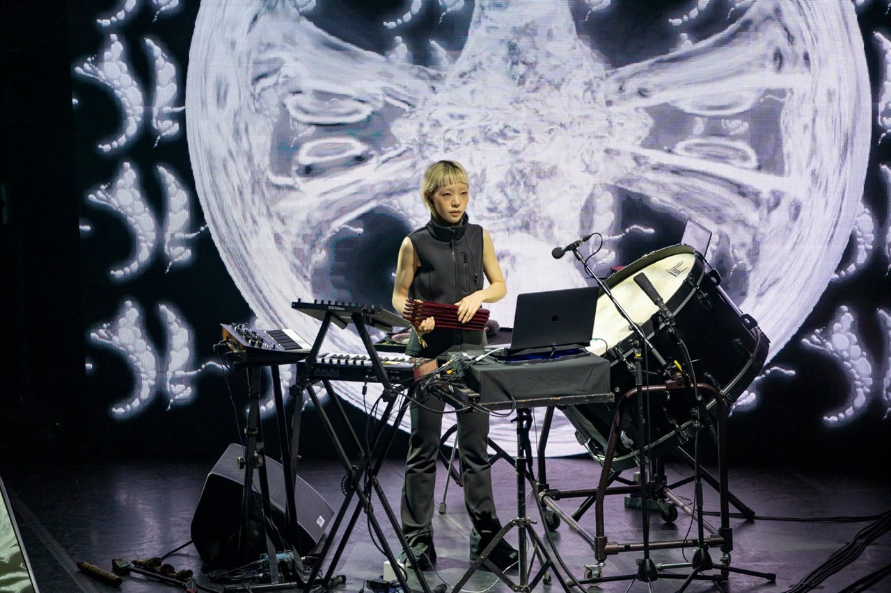 첫 곡 '동창이'로 공연의 시작을 밝혔다. 징소리가 샘플링되어 반복되고, 평시조 '동창이 밝았느냐'의 가사가 박민희의 음성으로 라디오 이펙트되어 겹쳐진다. 오히려 여명이 밝혀지지 않은 밤의 기운이 곡명과의 아이러니 속에 묘한 기운을 만든다. 이내 두번째 곡 '희문'과 세번째 '전폐희문'으로 오히려 동창이 밝혀지는 듯 했다. 종묘제례악에서 남창으로 듣는 이 곡을, 여성인 박민희의 부드러움 속 추진력을 가진 목소리에 느낌있는 손동작, 최혜원의 대북소리의 고동과 박을 칠 때의 날렵함이 돋보였으며, 소리가 사라지는 시간(Decay Time)까지 여운을 주었다.