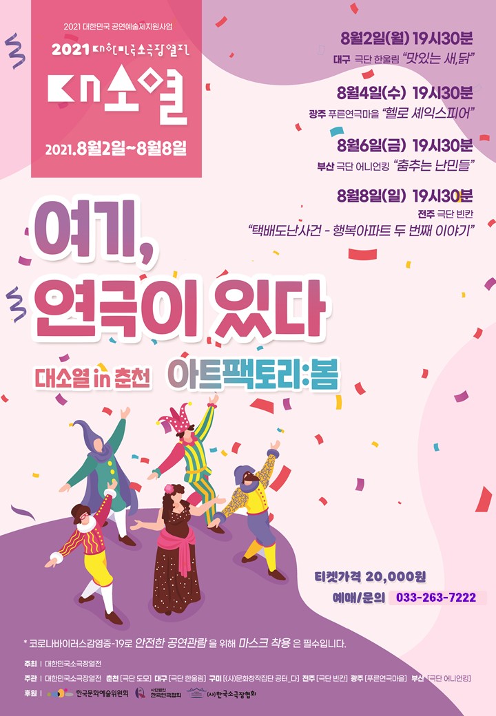 다양한 색깔의 작품과 배우들의 열연을 기대할 수 있는 ‘2021 대한민국소극장열전’은 오는 8월 2일(월), 4일(수), 6일(금), 8일(일) 총 4일 동안 개최되며, 아울러 ‘코로나19 확산 방지’를 위한 공연장 방역 수칙을 준수하여 진행 될 예정이다.