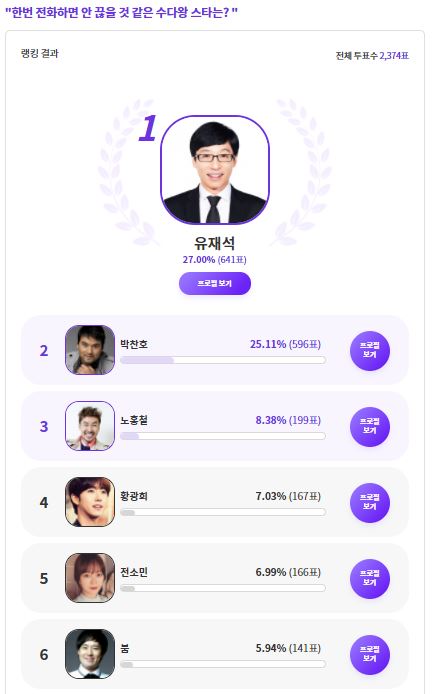 커뮤니티 포털사이트 디시인사이드(대표 김유식)와 취향 검색 기업 마이셀럽스가 운영 중인 `익사이팅디시`가 `한번 전화하면 안 끊을 것 같은 수다왕 스타는?`으로 투표를 한 결과 유재석이 1위에 올랐다.