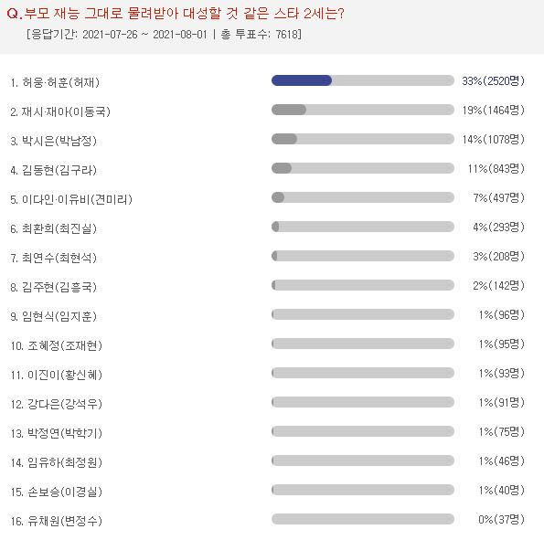 2위는 1,464(19%)표로 전 축구선수 이동국의 딸 재시·재아 자매가 차지했다. 모델 지망생인 재시는 활발한 SNS 활동을 통해 자신의 매력을 드러내고 있으며, 테니스 선수인 재아는 국제대회에서 우승하는 등 뛰어난 운동신경을 보여주고 있다.