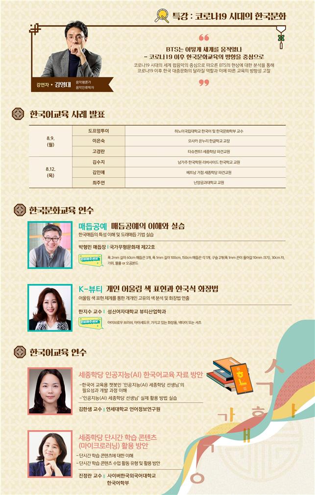둘째 날부터는 한국어, 한국 문화 교육에 대한 전문가* 특강이 이어진다. 8월 10일(화)에는 ‘매듭공예, 케이-미용(뷰티)’을 주제로 한국어 교육 현장에서 활용할 수 있는 한국 문화 교육 방안을 소개하고, 8월 11일(수)에는 ‘세종학당 인공지능 한국어 교육 자료 활용 방안’과 ‘세종학당 단시간 학습 콘텐츠 활용 방안’을 주제로 코로나19 이후 비대면 시대를 대비한 한국어 교실 운영 방향을 제시한다.