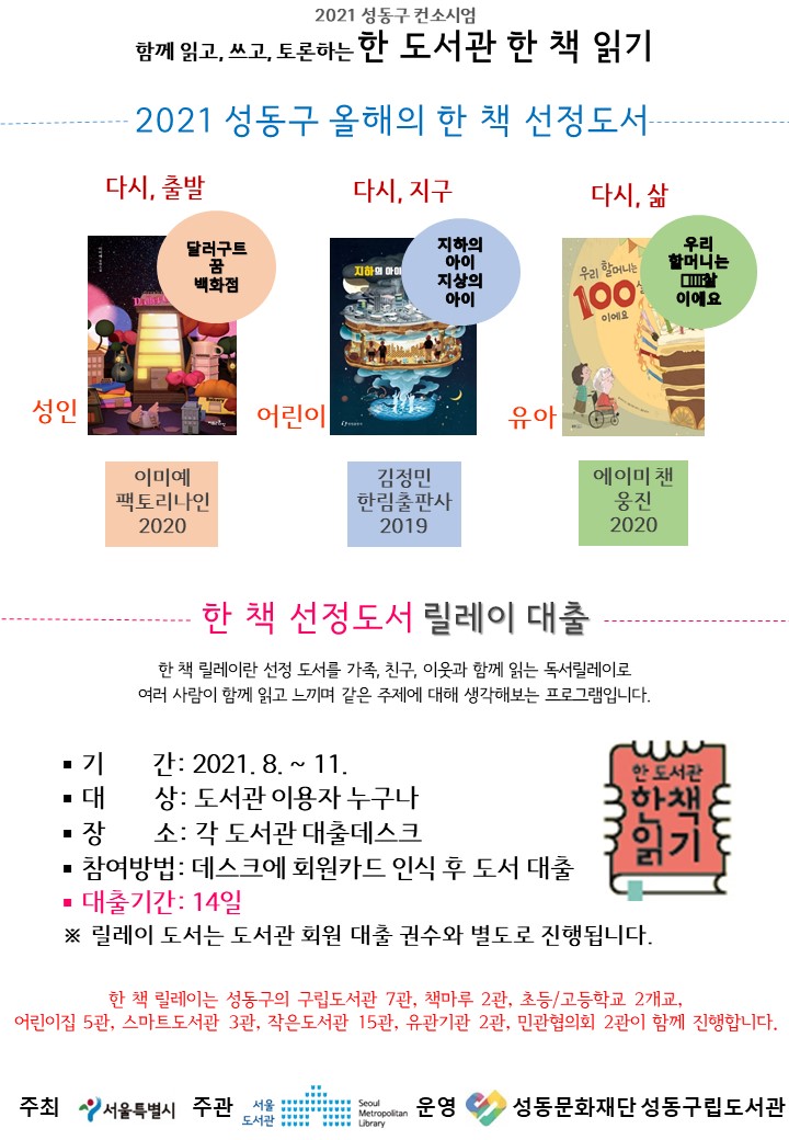 2021년 성동구 한 도서관 한 책 읽기 주제는 ‘다시, 출발’, ‘다시, 지구’, ‘다시, 삶’이다. 선정도서는 ‘달러구트 꿈 백화점’, ‘지하의 아이 지상의 아이’, ‘우리 할머니는 100살이에요’이다.