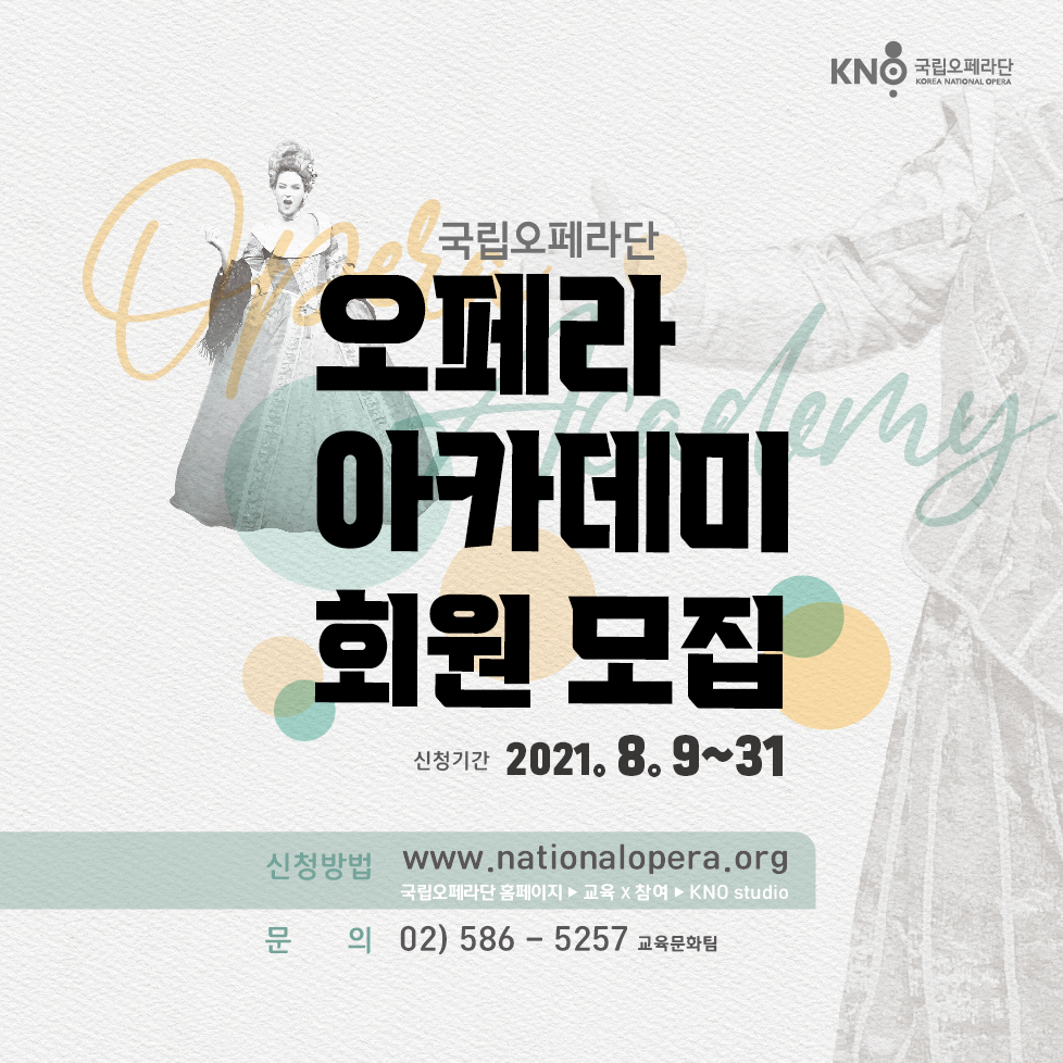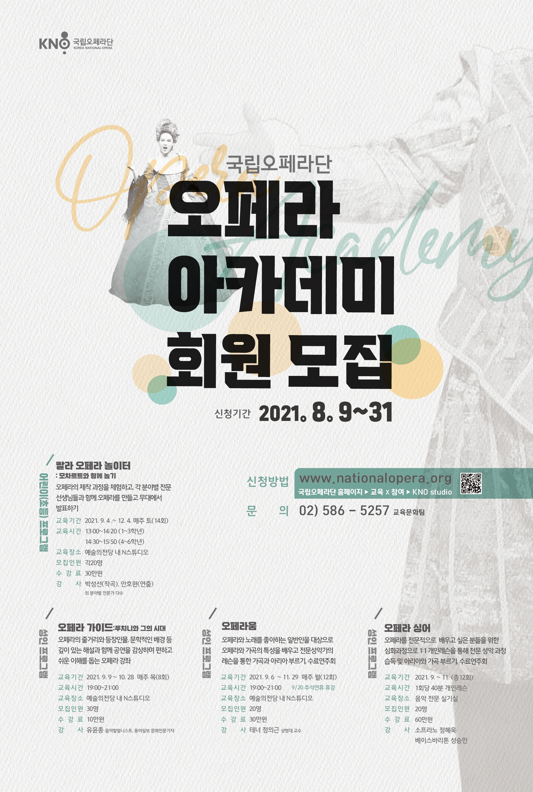[플레이뉴스 문성식기자] 국립오페라단(단장 겸 예술감독 박형식)은 오페라를 통해 대중에게 통합적인 음악교육을 제공하고자 오페라 아카데미(KNO스튜디오) 일반과정을 신설하고 수강생을 모집한다.