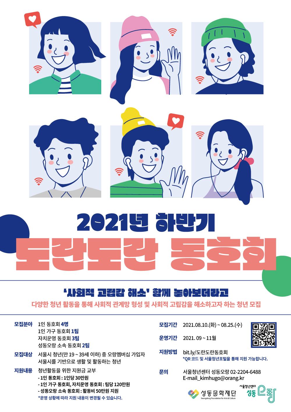 하반기 ‘도란도란 동호회’는 1인 동호회 4명, 1인 가구 동호회 1팀, 자치운영 동호회 3팀, 성동오랑 소속 동호회 2팀 등 총 10팀을 모집한다. 지원 자격은 서울시에 거주 중이거나 생활권을 둔 청년(만 19세 ~ 39세 이하) 중 오랑멤버십에 가입한 자에게 주어진다. 선정자는 다양한 청년활동을 위한 활동비를 참여 방법에 따라 30 ~ 120만 원까지 지원할 예정이다.