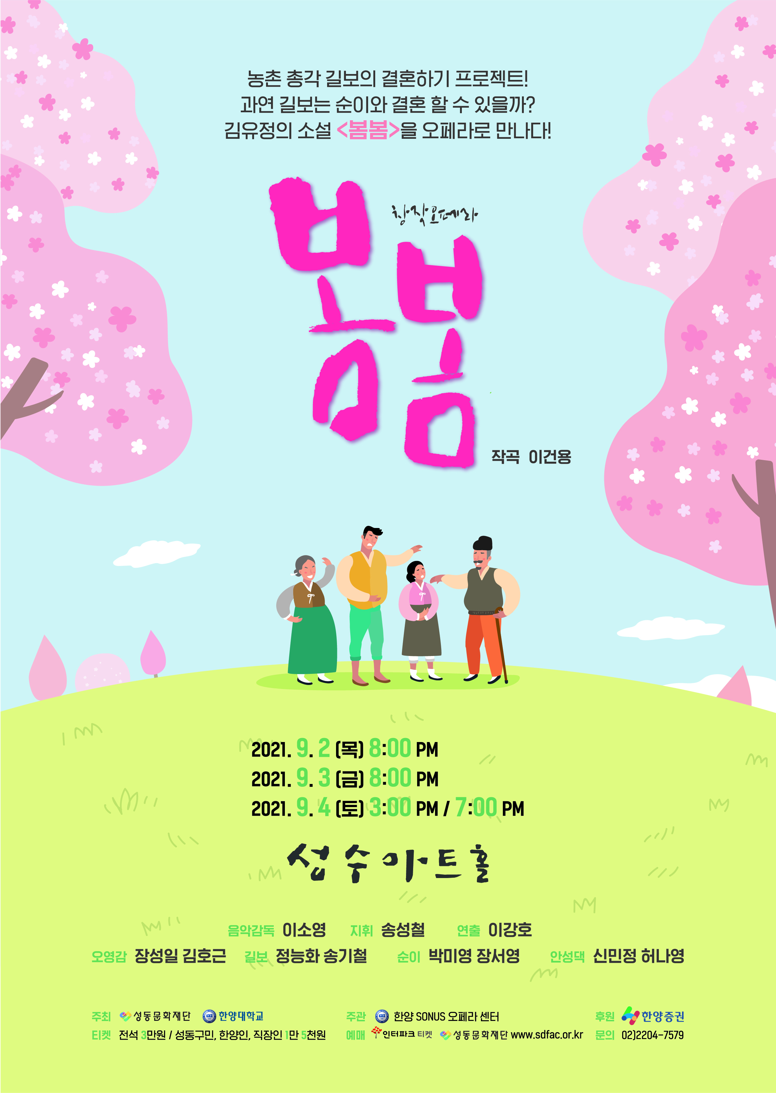 [플레이뉴스 문성식기자] 재단법인 성동문화재단(이사장 정원오)은 한양대학교 음악대학(학장 박정원)과 공동 제작한 창작 오페라 ‘봄봄’ 시즌 2를 오는 9월 2일부터 9월 4일까지 성수아트홀에서 개최한다.