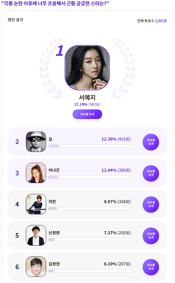 총 투표수 3,391표 중 583(17.19%)표로 1위에 오른 서예지는 지난 4월 전 애인 김정현 가스라이팅 논란으로 큰 곤욕을 치르고 모든 연예계 활동을 중단했다. 활동을 중단한 지 두 달 만에 자신의 근황을 공개했던 서예지는 이후 아무런 활동이 없어 팬들의 궁금증을 자아내고 있다.