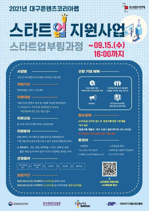 [플레이뉴스 문성식기자] 대구광역시가 주최하고 대구디지털산업진흥원(DIP)이 주관하는 대구콘텐츠코리아랩이 9월 15일까지 ‘2021년 스타트업 지원사업 - 스타트업 부팅과정’ 참가자를 모집한다.