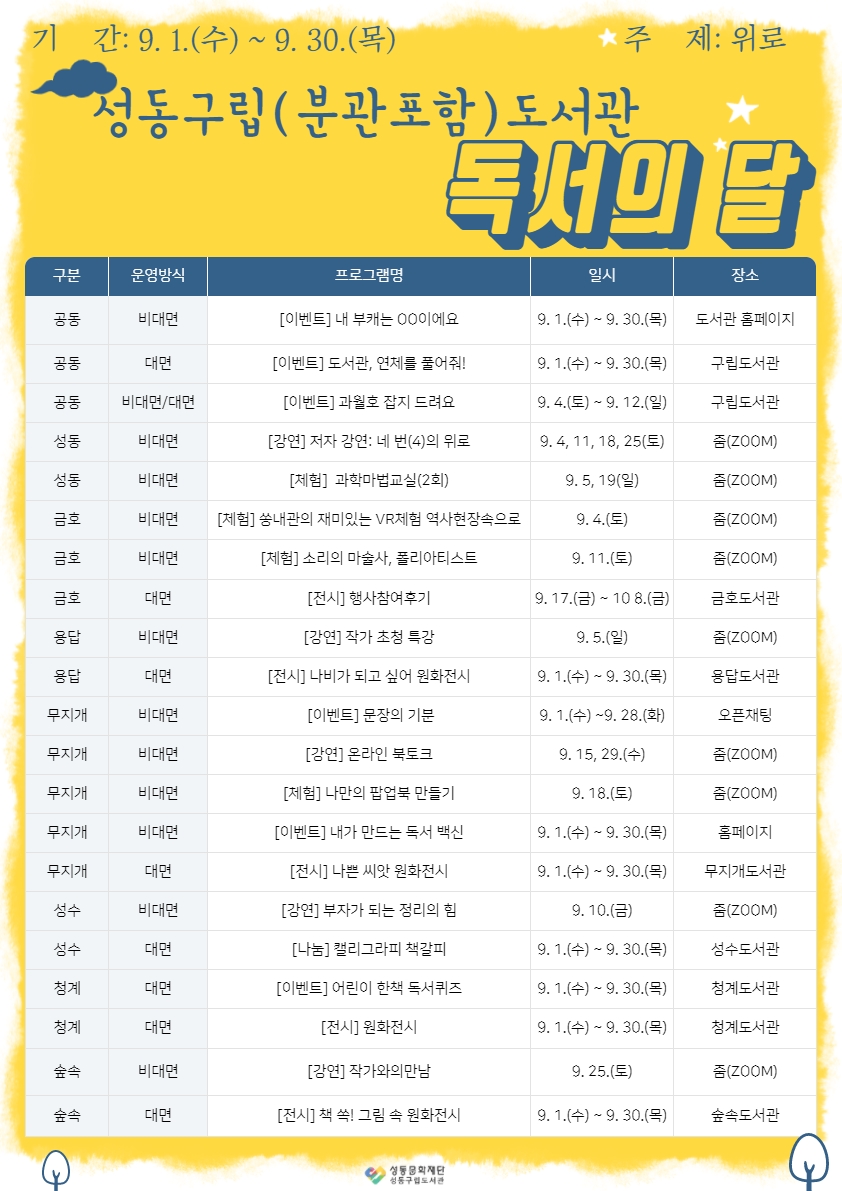 독서의 달은 코로나19 확산 방지를 위한 사회적 거리두기 4단계 연장으로 지친 구민에게 ‘위로’를 건네고자 준비되었다. 강연, 체험, 이벤트 등 다양한 볼거리를 비대면 행사 위주로 운영할 예정이다.