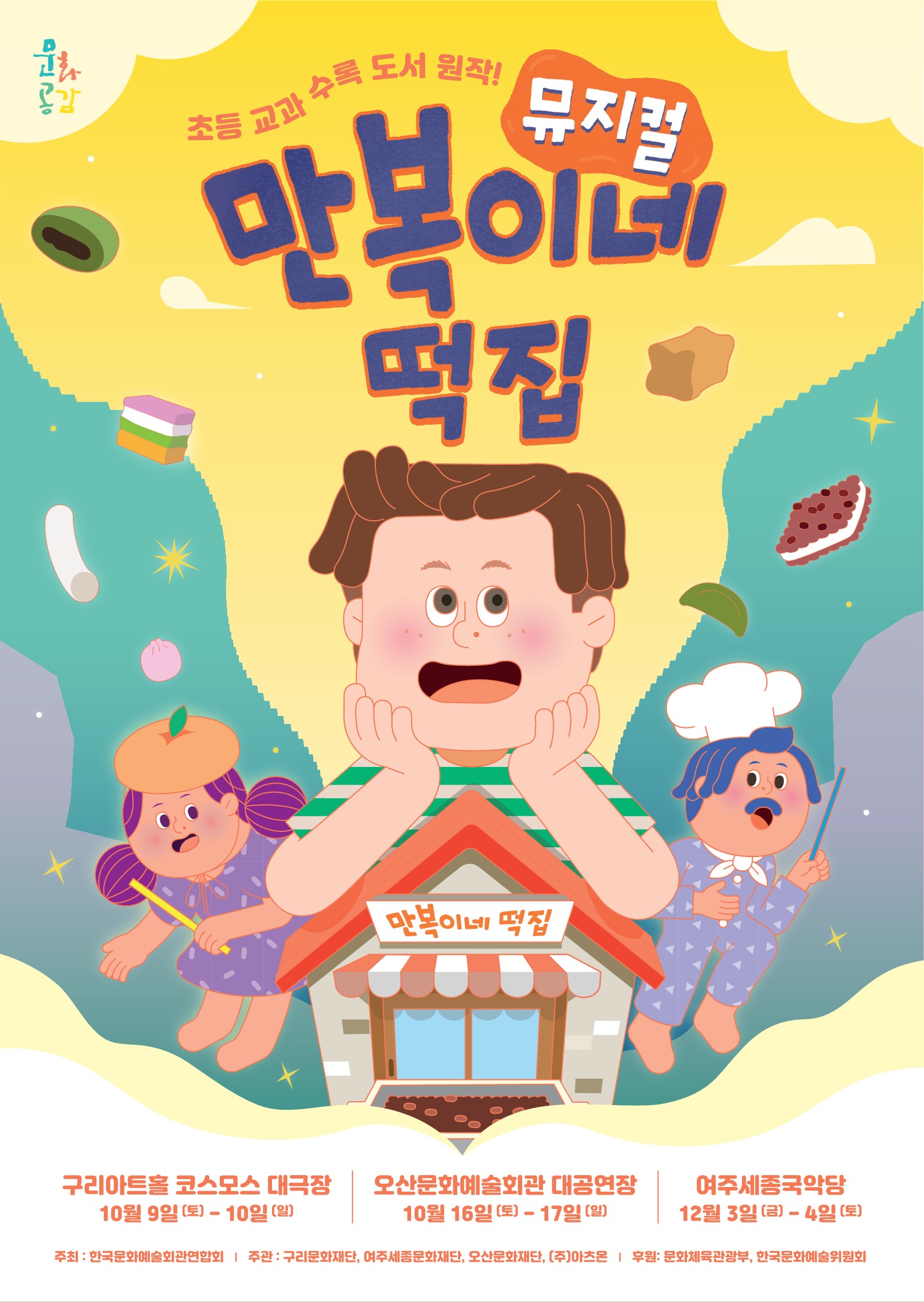| | 공 연 명 : '만복이네 떡집' | 날짜 및 장소 :10월 9일-10일 구리아트홀 대극장 10월 16일- 17일 오산문화예술회관 대공연장 12월 3일- 4일 여주세종국악당 | 티켓가격 : 전석2만원 | 주최 ∙ 주관: 한국문화예술위원회/구리문화재단,오산문화재단,여주문화재단, ㈜아츠온 | 사진자료: www.webhard.co.krID, PW: prmadame |홍보 문의: PRM 김도연 010-7272-0828 |