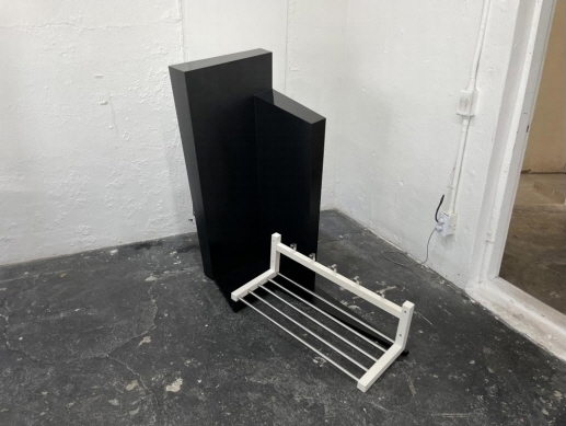 기울어진 스탠드 옷걸이와 반투명 아크릴 구조물, 기울어진 모자걸이와 대리석, 냄비뚜겅정리대와 투명 아크릴은 떠받치거나 거꾸로 세우거나 확산하는 형태로 불균형의 통일을 이룬다.