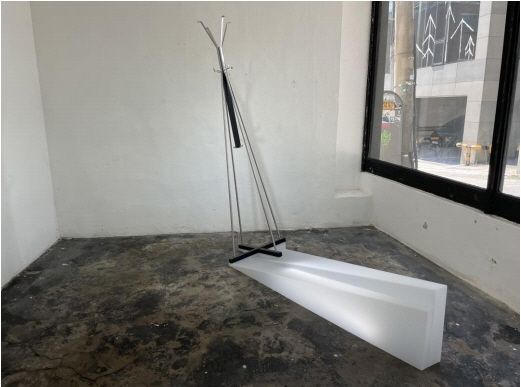 기울어진 스탠드 옷걸이와 반투명 아크릴 구조물, 기울어진 모자걸이와 대리석, 냄비뚜겅정리대와 투명 아크릴은 떠받치거나 거꾸로 세우거나 확산하는 형태로 불균형의 통일을 이룬다.