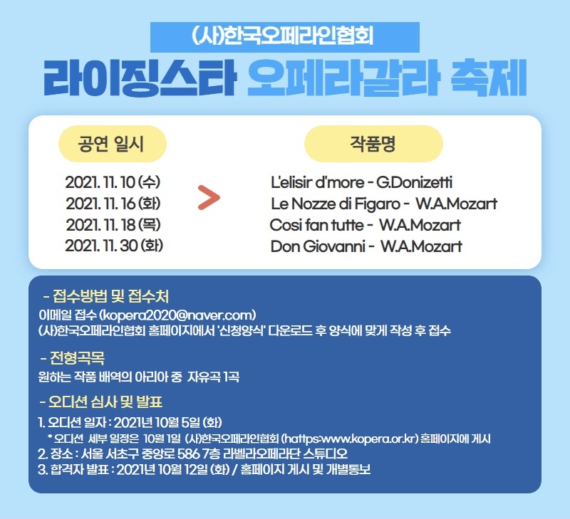 [플레이뉴스 문성식기자]사단법인 한국오페라인협회(이사장 김향란)가 주최하고 서울특별시가 후원하는 '2021 라이징스타 오페라갈라축제'가 11월에 개최된다. ‘젊고 유능한 성악인재 양성’이라는 목적을 가지고 개최되는 축제로, 대한민국 오페라의 미래를 담보할 재능있는 젊은 성악가들에게 다양한 경험과 기회를 제공한다.