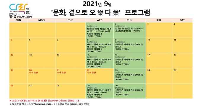 9월에는 총 2개의 프로그램을 진행한다. 먼저,‘테마와 함께 떠나는 세계여행지’는 음악, 영화, 미술 등 예술과 관련된 여행 강좌를 통해 다양한 정보들을 소개하고자 한다. 코로나19로 해외여행을 가지 못하는 주민들의 아쉬움을 덜어주기 위해 기획되었다.