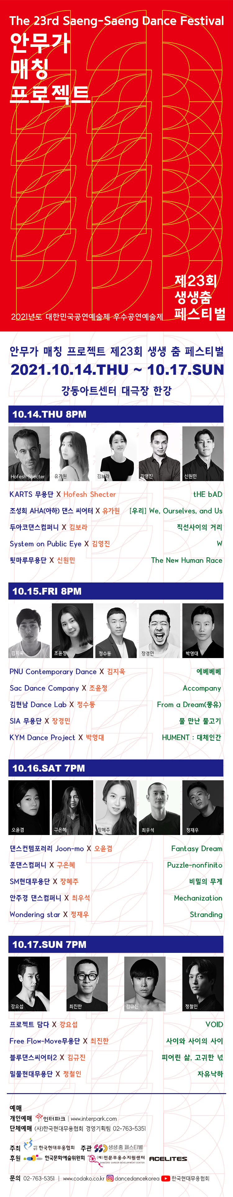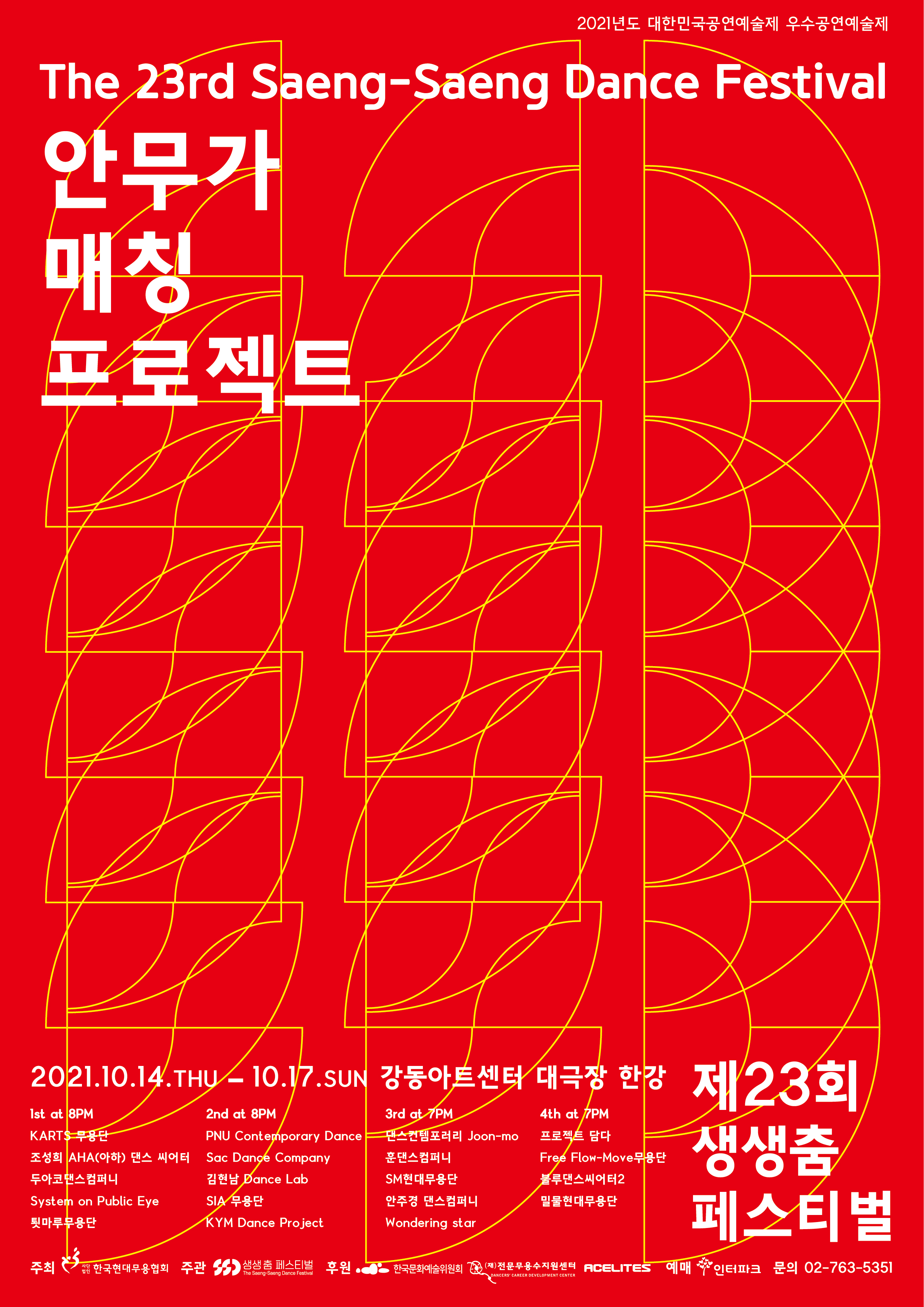 한국문화예술위원회의 ‘2021년 대한민국공연예술제 지원사업’에 무용 분야 우수공연예술제로 선정된 본 페스티벌은 공연예술의 활성화와 콘텐츠화를 위해 ‘생생 춤 페스티벌’로 진행해오던 기존 명칭에서 올해부터 ‘안무가 매칭 프로젝트 생생 춤 페스티벌’로