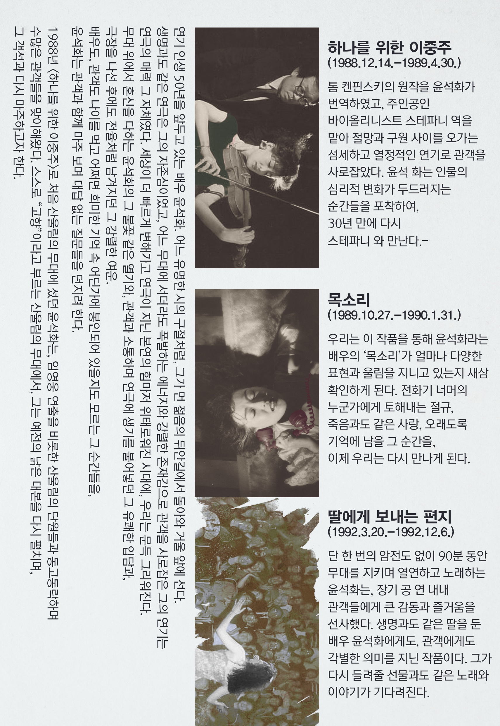 구성/연출/출연 윤석화 / 기획 및 제작 극단/소극장 산울림무대미술 박성민조명감독 민경수음악감독 최재광영상 연출 이신혜