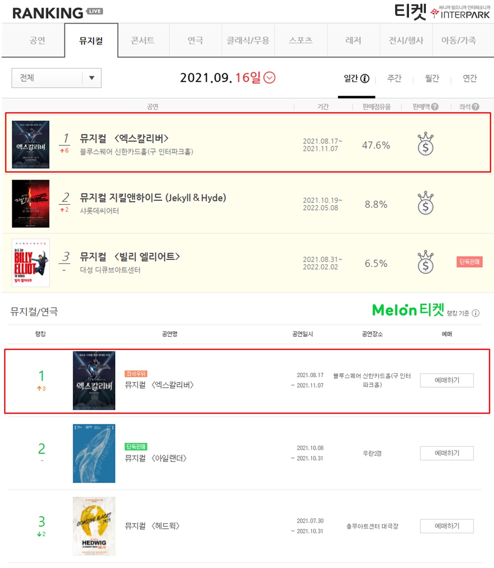 뮤지컬 '엑스칼리버'는 오늘(16일) 오후 2시 진행된 인터파크 티켓과 멜론 티켓 사이트 내 전체 작품 예매 순위에서 랭킹 1위를 휩쓸었다. 일부 회차는 30초 만에 매진하는 등 1~3차 티켓 오픈에 이어 4차 티켓 오픈까지'엑스칼리버' 공연을 향한 관객들의 식지 않는 인기를 실감하고 있다.