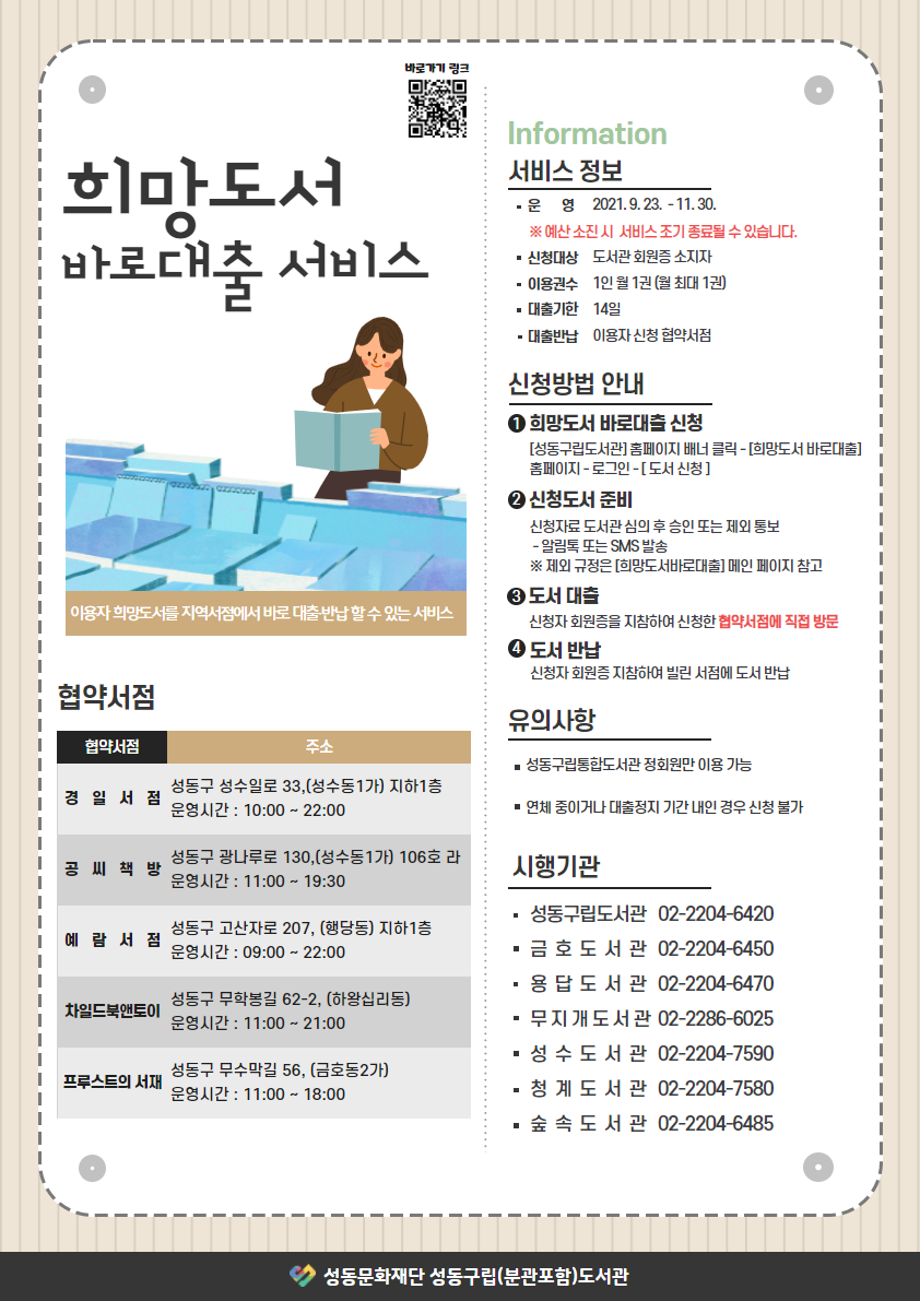 [플레이뉴스 문성식기자] 재단법인 성동문화재단(이사장 정원오)이 운영하고 있는 성동구립(금호․용답․무지개․성수․청계․숲속)도서관은 오는 9월 23일부터 성동구 관내 지역서점 5곳과 ‘희망도서 바로대출 서비스’를 운영한다.