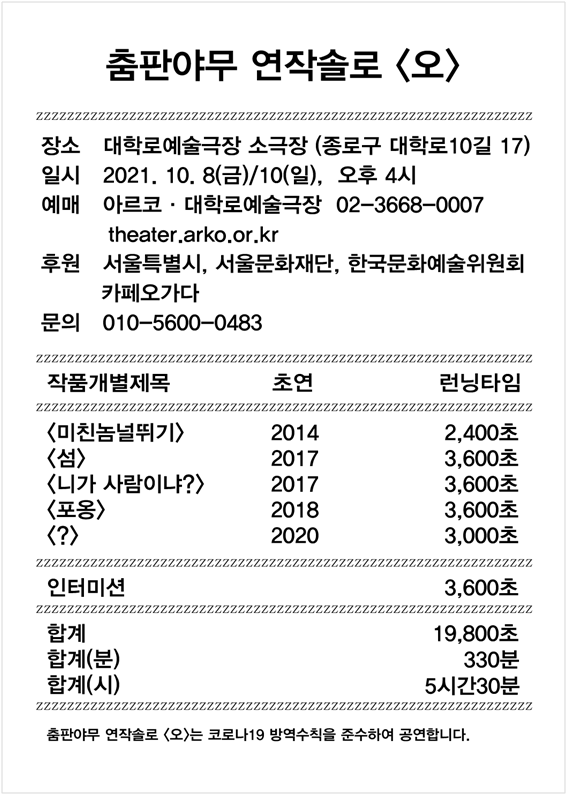 그리고 춤판야무의 앞으로 나아갈 길과 방향을 세우고자 한다. 연작솔로 '오'는 춤판야무솔로연작의 관통된 주제를 펼치기 위해 한 호흡으로 내딛는 디딤돌이 될 것이다.
