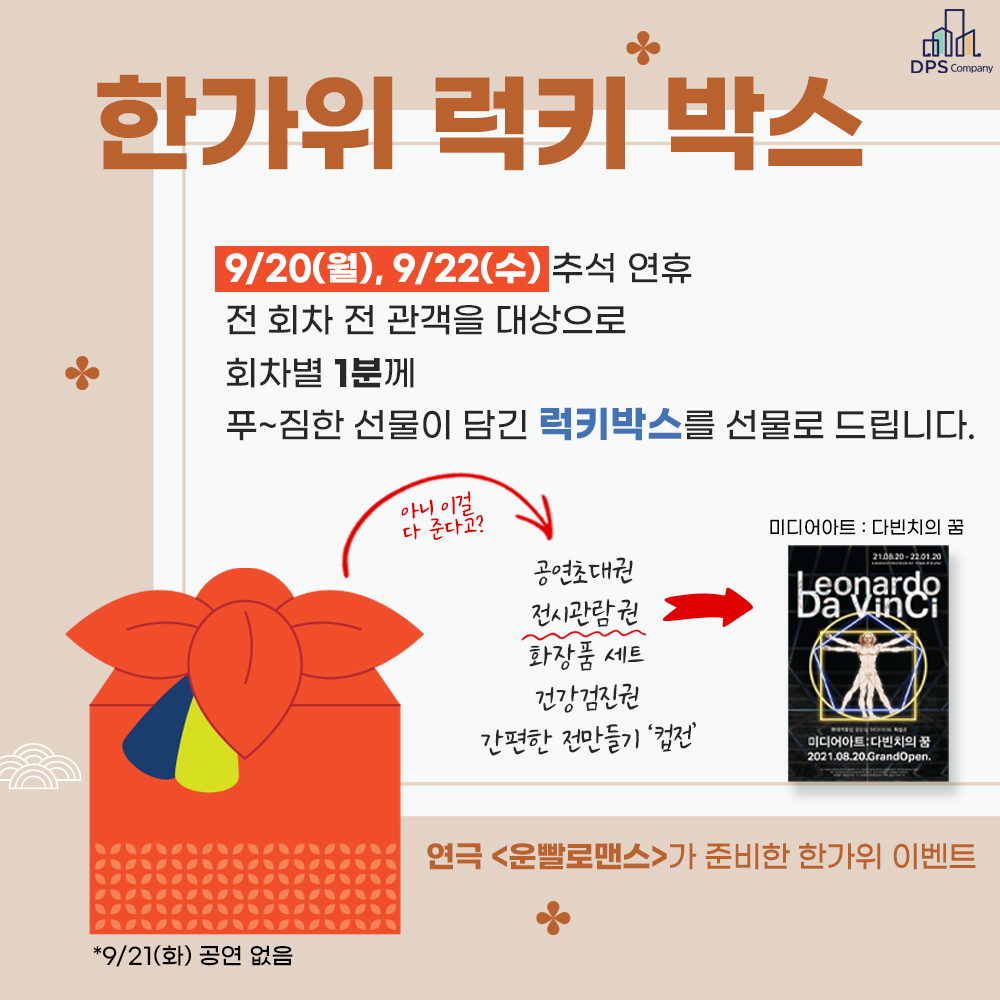 공연을 진행하지 않는 추석 당일을 제외한 9월 20일과 22일 이틀간 전 회차에서 현장 이벤트로 진행된다.럭키박스는타 공연관람권 2매와 얼마 전 오픈한 동탄 롯데백화점에서 진행중인 ‘미디어아트:다빈치의 꿈’ 전시회 관람권 2매,건강검진권 1매,‘리앤케이’화장품세트,간편히 만들 수 있는 컵전세트로 푸짐하게 구성했다.
