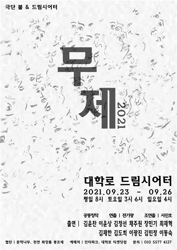 연극 「무제 2021」은 극단 불 공동창작, 전기광 연출가가 작품을 연출하여 배우김윤찬, 이윤상, 김정선, 채주원, 장민기, 최재혁, 김재한, 김도희, 이광진, 김민정 등이 출연해 50대부터 20대까지 중년의 배우들과 신인 배우들이 함께 어우러져 여러 인간 군상들의 행복의 본질에 대한 이야기를 나눈다.