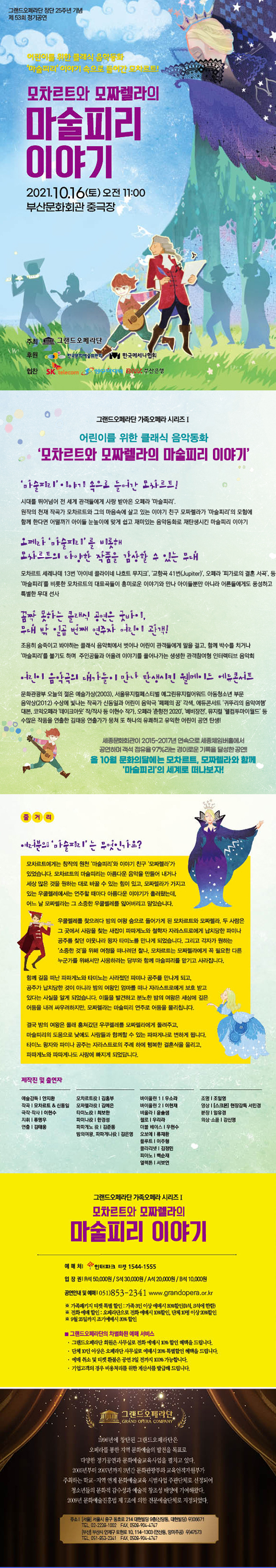 [플레이뉴스 문성식기자] 그랜드오페라단은 올해로 창단 25주년을 맞이하여 오는 10월 16일(토) 부산문화회관 중극장에서 어린이를 위한 클래식 음악동화 - '모차르트와 모짜렐라의 마술피리 이야기' 공연을 개최합니다.