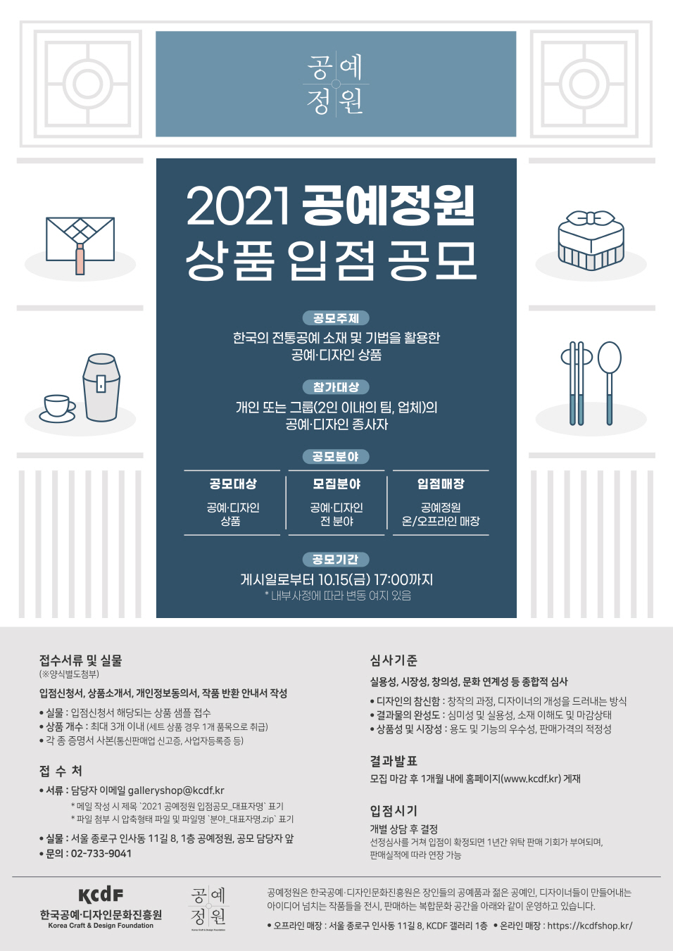 2021 공예정원 입점 상품 공모는 오는 9월 27일(월)부터 10월 15일(금) 17시까지 접수 진행되며, 신청 서류와 해당 상품 실물을 함께 기간 내에 제출하면 된다.