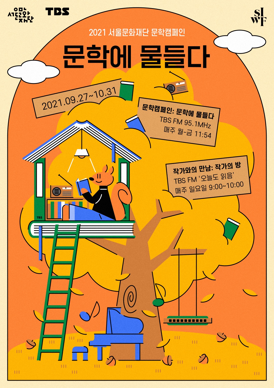 □ 서울문화재단(대표이사 직무대행 주용태)은 9월 27일(월)부터 10월 31일(일)까지 TBS 라디오를 통해 <2021 문학캠페인 ‘문학에 물들다’>를 진행한다. 청취자를 위해 문학작가가 직접 자신의 작품을 낭독하는 한편 미니 북콘서트 형태의 작가별 심층 인터뷰도 선보인다.