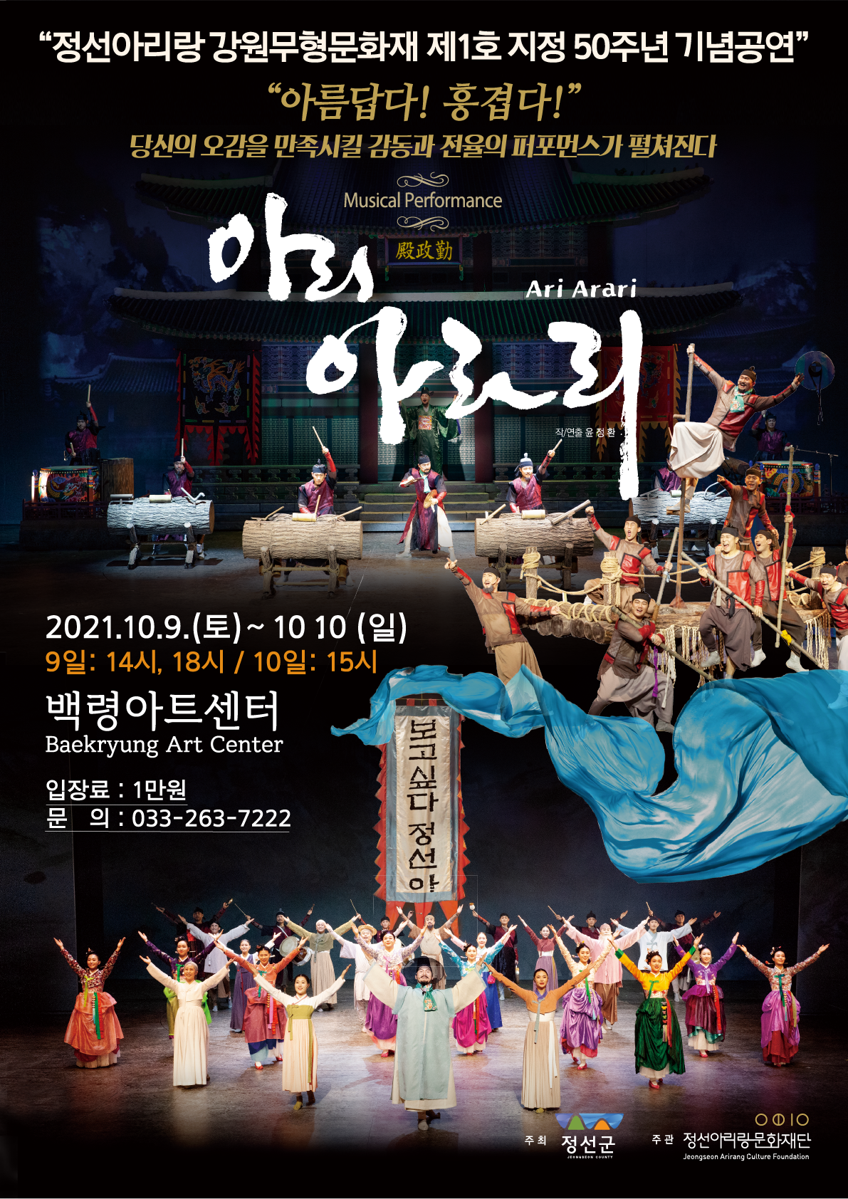 뮤지컬 퍼포먼스 '아리 아라리'는 2021년 10월 9일 14:00, 16:00 2회, 10월 10일 15:00 등 이틀간 총 3회에 걸쳐 강원대학교 백령 아트센터에서 선보일 예정이며, 현장에서는 회차별 사전 방역, 좌석간 거리두기, 발열 체크, 손 소독, 클린강원 패스포트 및 QR코드 인증 등 관람객의 안전을 위한 방역수칙을 한층 더 강화하여 진행될 예정이다.춘천 포스터