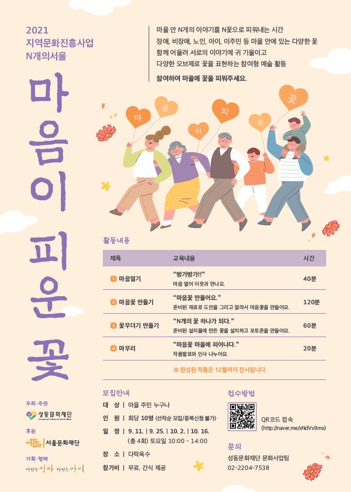 [플레이뉴스 문성식기자] 재단법인 성동문화재단(이사장 정원오)은 서울문화재단 공모사업 「2021 지역문화진흥사업 - N개의 서울-문화+성동」의 일환으로 문화예술을 교육 프로그램 ‘마음이 피운 꽃’을 운영한다.