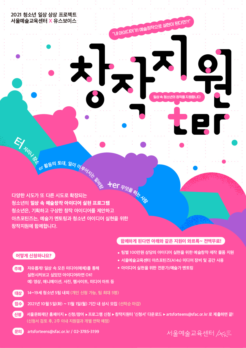 서울예술교육센터는 2020년 11월부터 청소년만을 위한 미디어 기반 융합예술교육 프로젝트와 예술창작공간 ‘아츠포틴즈’를 운영해왔다. 이번에 진행하는 '일상 상상 프로젝트'는 코로나19로 문화예술을 체험하는데 제약을 받고 있는 청소년을 대상으로 아이디어를 실현하기 위한 ‘창작지원+er’(이하 ‘창작지원터’)와 예술가와 함께 창작과정을 경험하는 ‘창작하루’ 등의 프로그램이다.