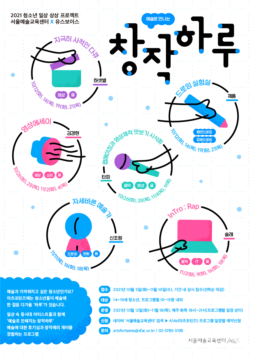 보다 자세한 정보는 서울문화재단 누리집(www.sfac.or.kr) 또는 서울예술교육센터 공식 인스타그램(www.instagram.com/artsforteens), 서울예술교육센터 네이버 예약 페이지(naver.me/xkxIARzu)에서 확인할 수 있다. (문의 02-3785-3199/artsforteens@sfac.or.kr)