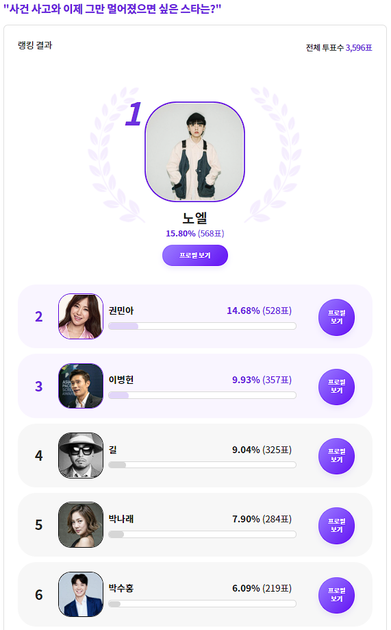 커뮤니티 포털사이트 디시인사이드(대표 김유식)와 취향 검색 기업 마이셀럽스가 운영 중인 `익사이팅디시`가 `사건 사고와 이제 그만 멀어졌으면 싶은 스타는?`으로 투표를 한 결과 노엘이 1위에 올랐다. 이 투표는 지난 10일부터 16일까지 총 7일간 진행했다.