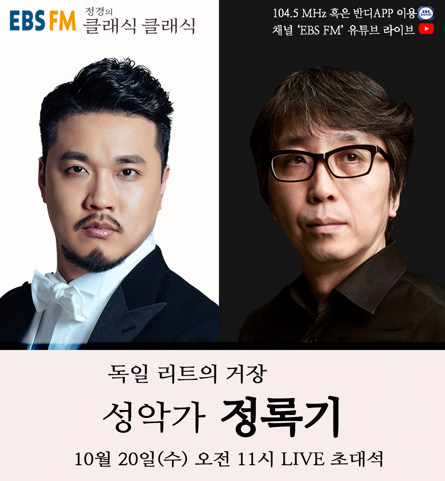 매주 수요일 코너인 '수요 초대석'에서는 클래식 음악계의 명사들을 초대하고 있다. 10월 20일 수요일 오전 11시에는 영혼을 흔드는 호소력 짙은 음색으로 지휘자 헬무트 릴링, 톤 쿠프만, 페터 슈라이어가 손꼽은 바리톤 정록기 교수가 출연해서 자신의 음악과 인생에 대한 이야기를 들려줄 예정이다.