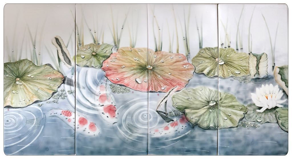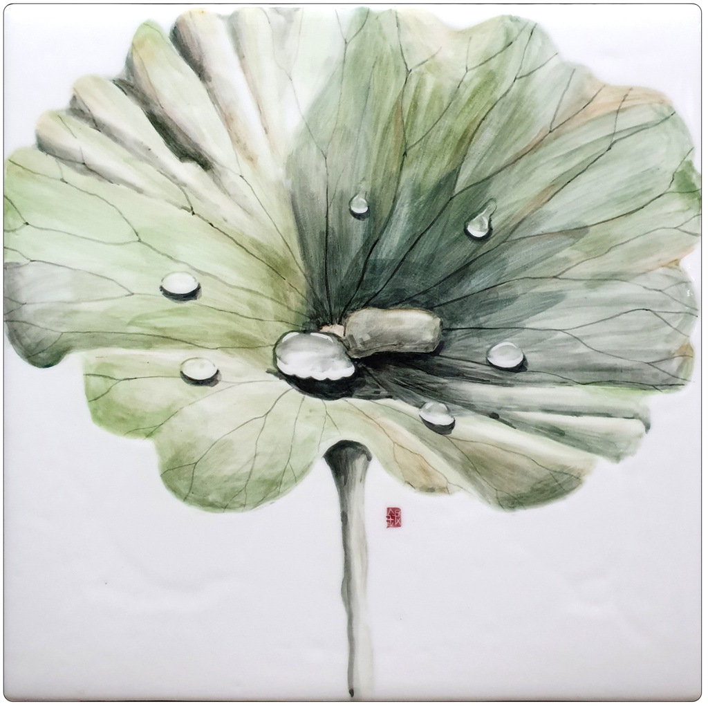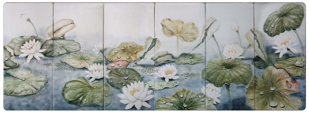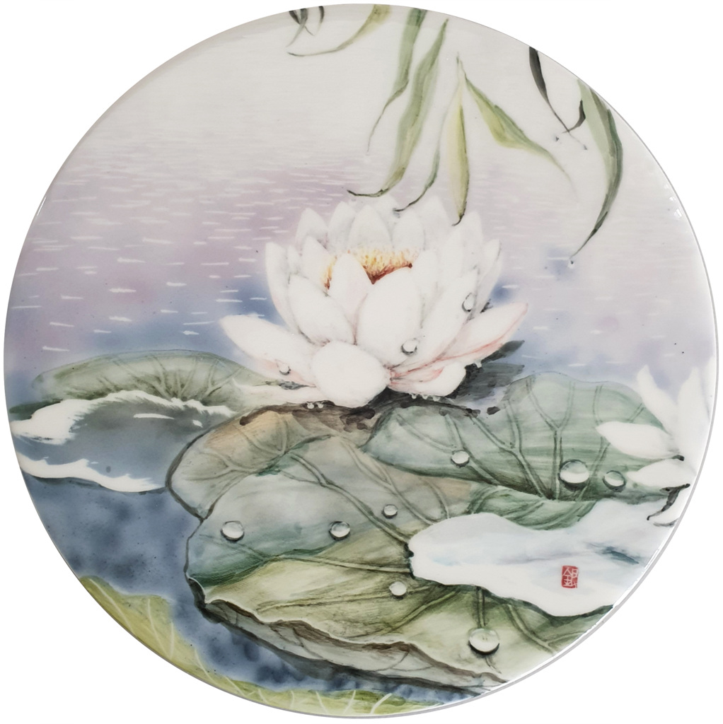 작품명 "연과 물방울"은 경주 여행 중 동궁과 월지 앞 연못 안에 연꽃들이 비를 맞고 있는 모습에서 영감을 얻어 작품으로 완성시켰으며, 소박한 흰색 연꽃과 초록의 연잎이 소담스런 풍경을 만들어 정겨운 느낌이 가득하다.
