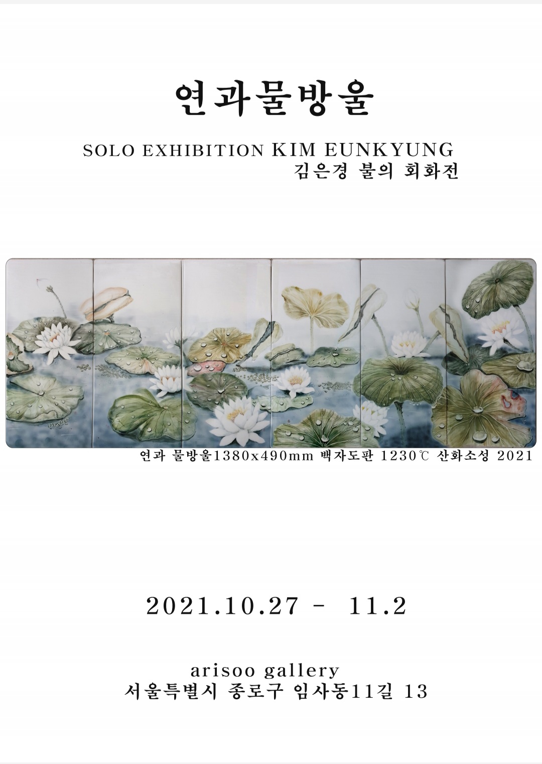오는 2021년 10월 27일(수) ~ 11월 2일(화)까지 서울 인사동 아리수갤러리에서 "연과 물방울展" 타이틀로 개인전을 진행한다. 세종대학교 융합예술대학원에서 도자회화를 전공하며 우리 전통 미술과 서양미술의 조화로움을 극대화시킨 작품들로 관람객을 맞이할 예정이다.